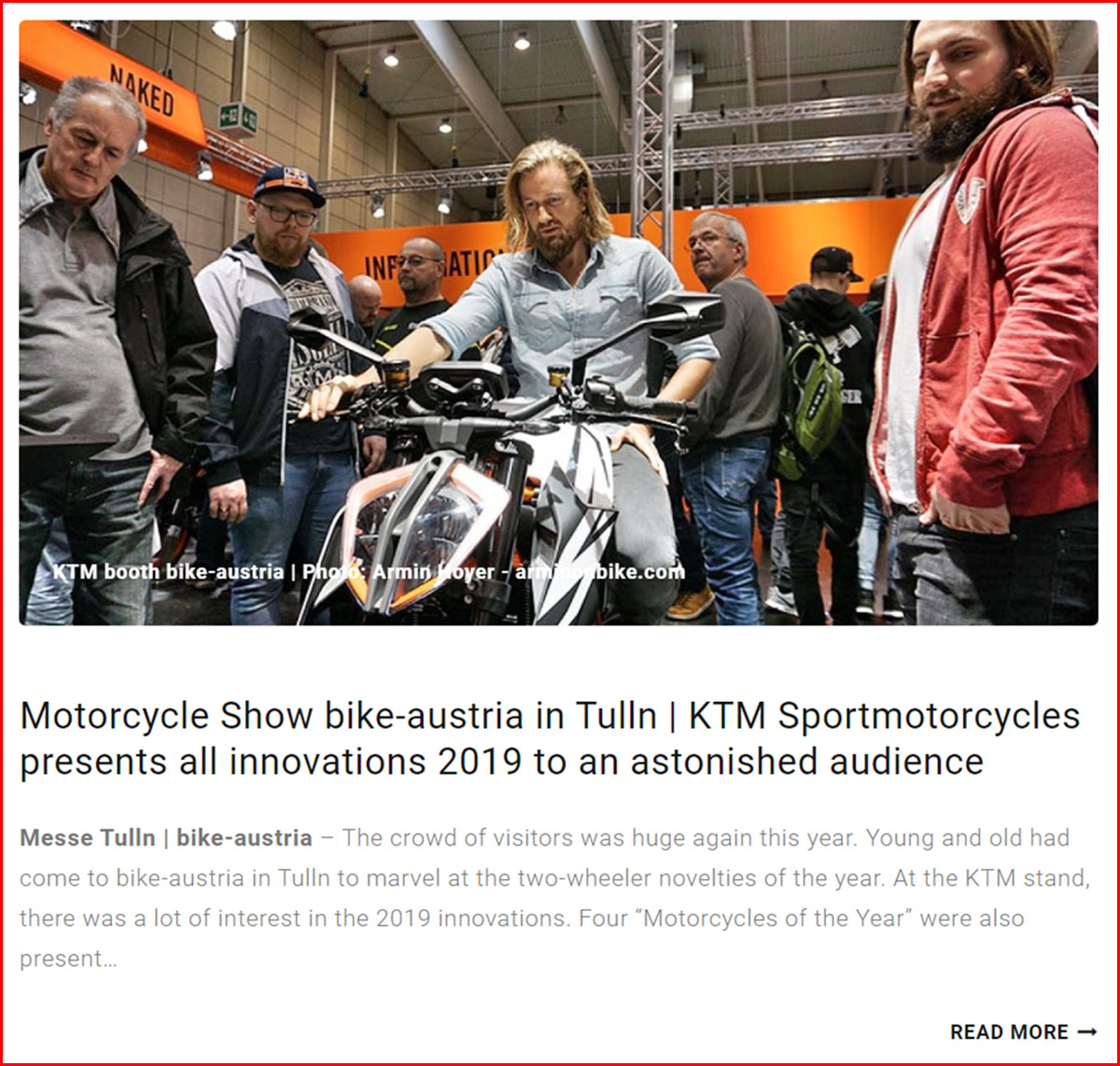Ranging from the international bike show EICMA to Road Safety Day. There is a wide array of events centred around vehicles. Trade fairs are crowd pullers all over Europe. Reporting, which accompanies the fairs in digital media, reminds visitors of the positive experience they had and also reaches those who didn’t attend. Posts about product presentations and world premieres, which aren’t publicly accessible, arouse interest in your target audience even in the run-up to events.
