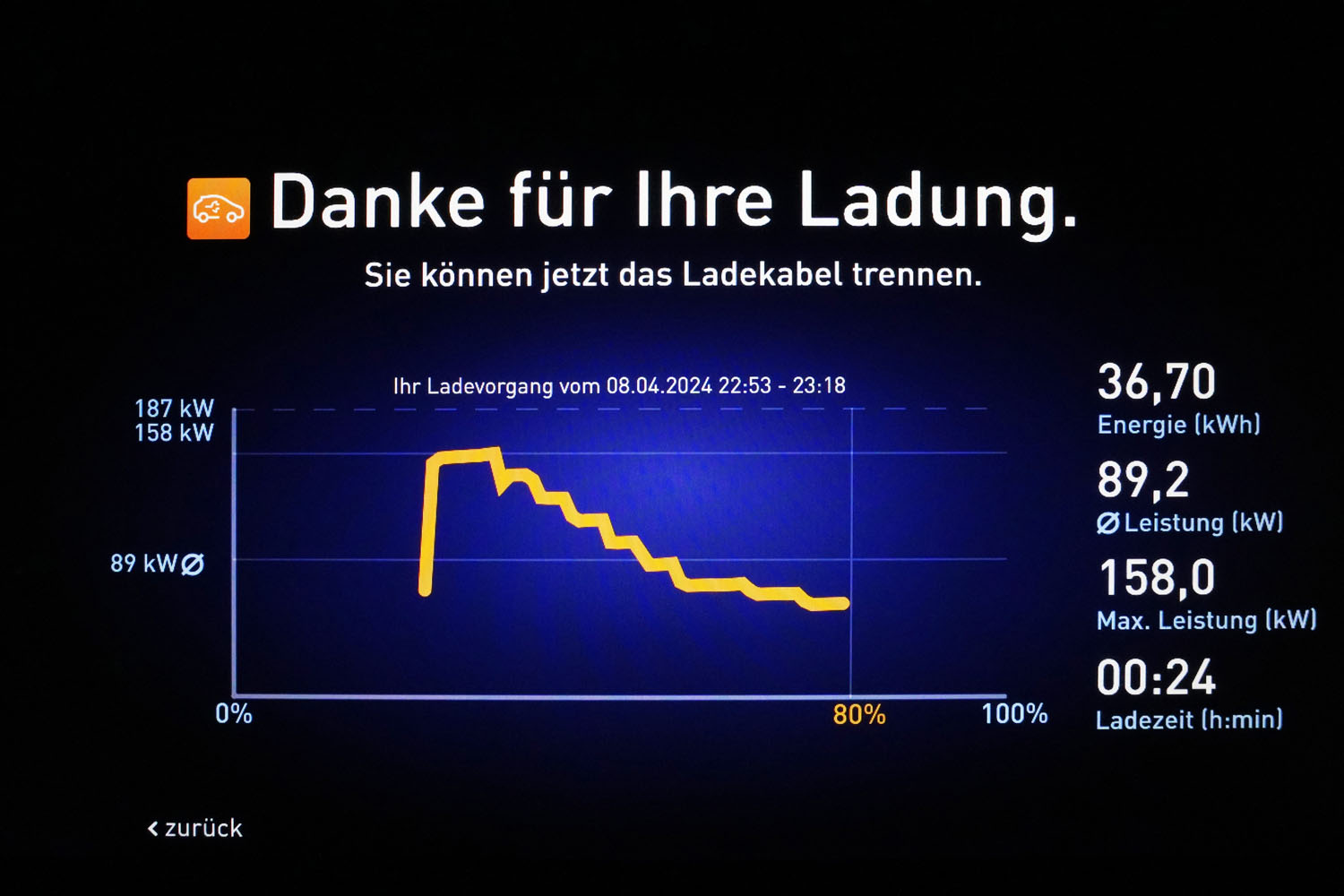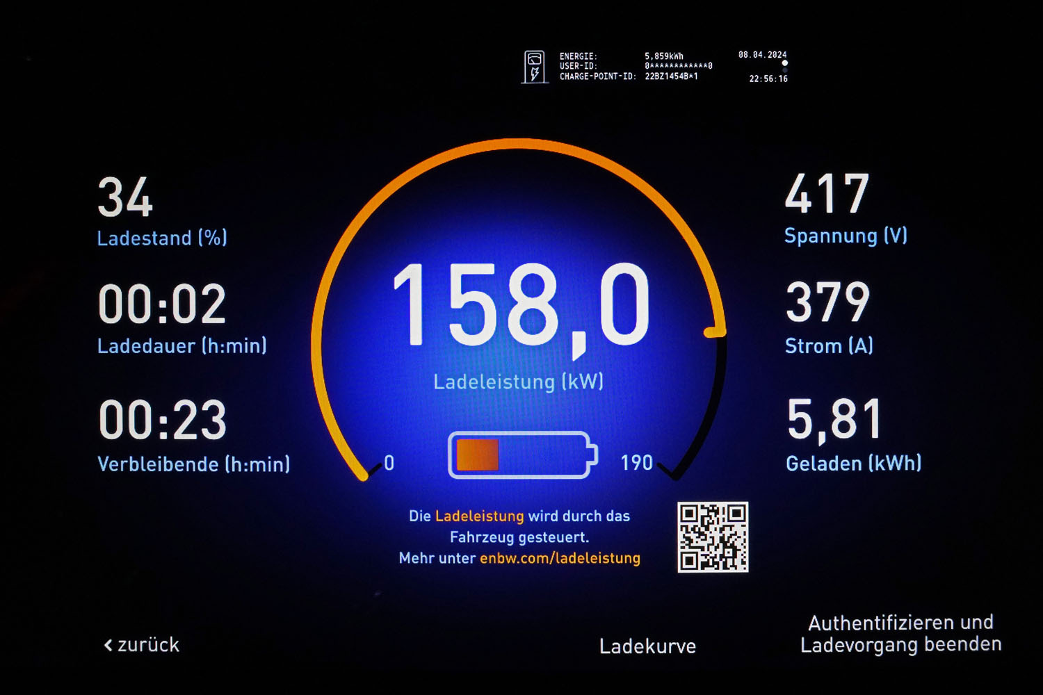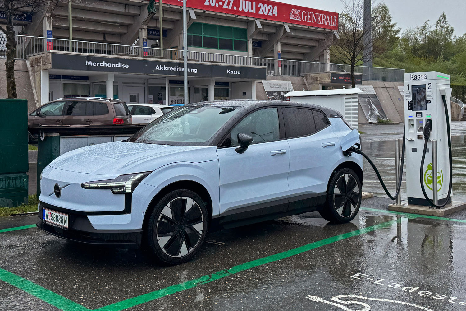So wurde der erste Ladestopp noch am Abend in Linz fällig. Am kostenpflichtigen Parkplatz beim Südbahnhofmarkt befindet sich ein Hyper Charger der Linz AG mit maximal 225 kW Ladeleistung. Dort beeindruckte mich der EX30 mit einer maximalen Ladeleistung von 157,7 kW – mehr als die Werksangabe. So konnte ich in 25:31 Minuten von 27 auf 80 Prozent SoC aufladen. Nach weiteren 144 Kilometern auf der Autobahn nach Salzburg und auf der Landstraße weiter nach Bad Reichenhall war der Akkustand wieder auf 25 Prozent geschmolzen. Mit der angezeigten Restreichweite von 60 Kilometern traute ich mich nicht ohne Ladestopp die restlichen 45 Kilometer nach Hause ins höhergelegene Tiroler Pillerseetal zu fahren. So musste ich zu später Stunde noch einmal an die Ladesäule. Beim 300 kW-Hyper-Charger von EnBW am Penny-Parkplatz in der Reichenbachstraße ging es aber wieder schnell. Mit maximal 158 kW war der Akku in 24 Minuten wieder bei 80 Prozent und es konnte weitergehen. In Tirol nutzte ich das Schnellladeangebot der Stadtwerke Kitzbühel. Am Parkplatz P7 des Workspace Start.n beim Tennisstadions konnte ich in einer Mittagspause in 55 Minuten den von 37 auf 94 Prozent aufladen. Dabei flossen 41,7 kWh Energie in den Akku.