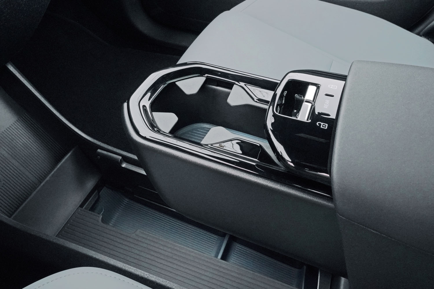 Die mit blassblauem 3D-Strickstoff bezogenen Sitze fühlen sich angenehm an und sind über ein quadratisches Drehrad an der Seite umfangreich elektrisch verstellbar. Das funktioniert sehr intuitiv und war damit gleichzeitig recht komfortabel. Etwas zu viel des Guten in Bezug auf die Reduktion ist neben dem eingangs erwähnten fehlenden Kombiinstrument die Bedienung der Fensterheber, die mit nur zwei Kippschaltern in der Mittelarmlehne zu steuern sind. Zwischen den vorderen und hinteren Fenstern muss durch Antippen umgeschaltet werden.
