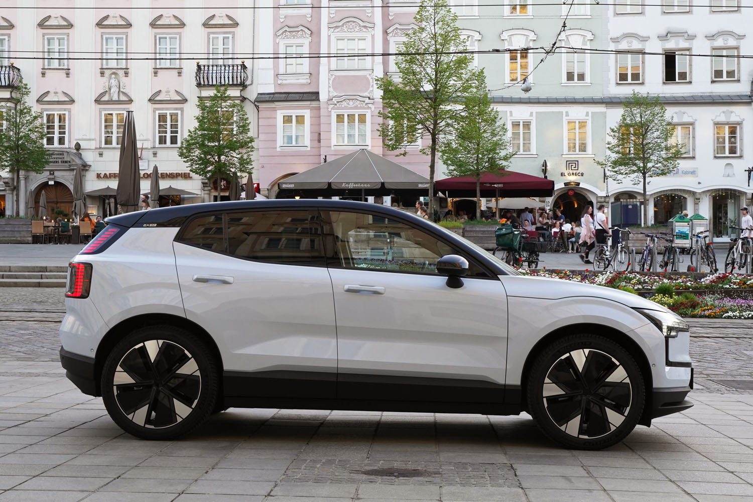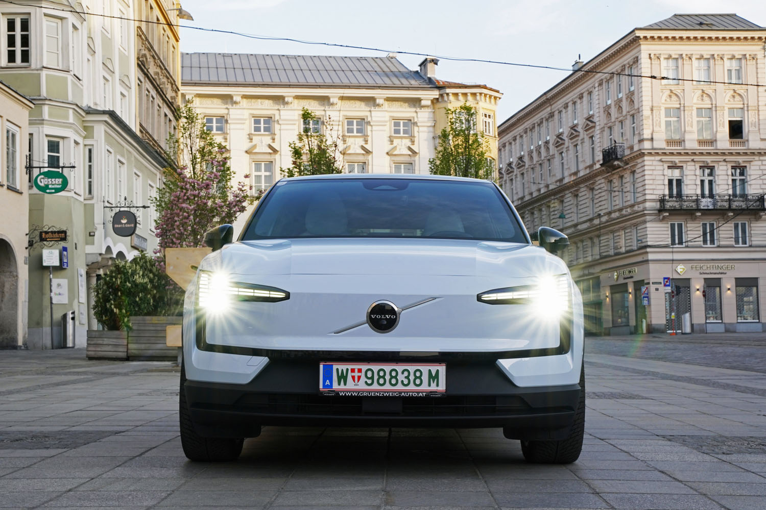 Nach dem Geschäftstermin stattete ich meiner alten Heimat Linz noch einen Besuch ab. Nachdem ich vorbei am Café Traxlmayr, dem Stammlokal in meiner Jugend, die Promenade entlang gefahren war, bot der in sanftes Abendlicht getauchte Linzer Hauptplatz eine wunderbare Atmosphäre, mir den neuen E-SUV einmal etwas genauer anzusehen.