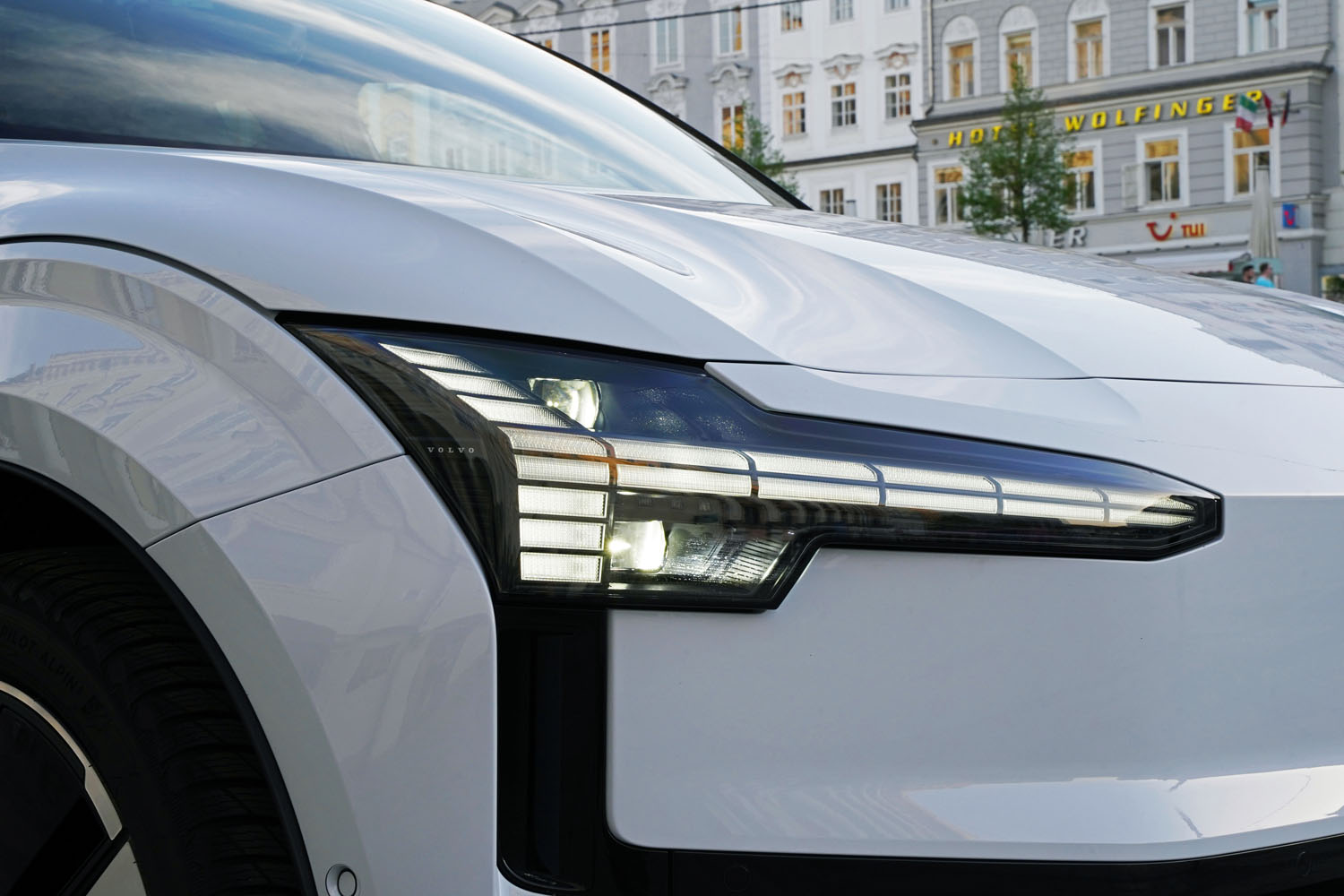 Die österreichische Niederlassung des Fahrzeugproduzenten stellte mir den Volvo EX30 für einen ausführlichen Test zwei Wochen lang zur Verfügung. Ich durfte mir den kompakten SUV in der Top-Ausstattung „Ultra“ und der leistungsstärksten Motorisierung mit Allradantrieb bei Automobile Schmidt in Salzburg abholen. Ausgestattet mit 20-Zoll-Rädern im sportlichen 5-Speichen-Design ist der kleine SUV trotz der kompakten Abmessungen eine imposante Erscheinung. Sehr interessant auch die Farbe „Cloud Blue“ – das blasse Blau wirkt je nach Lichteinstrahlung unterschiedlich intensiv. Am besten kommt der Farbton in der Dämmerung oder bei schwachem Licht zur Geltung.