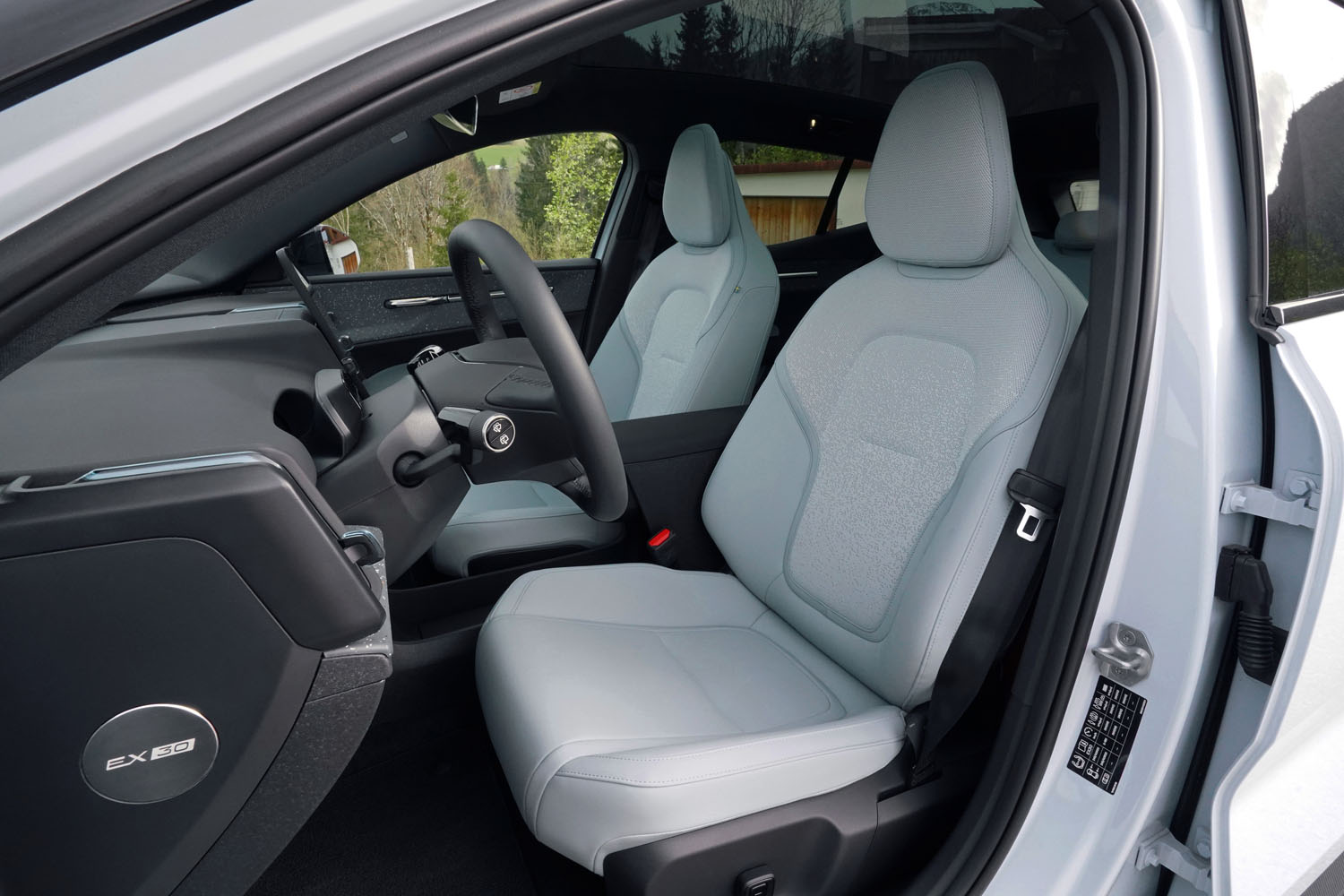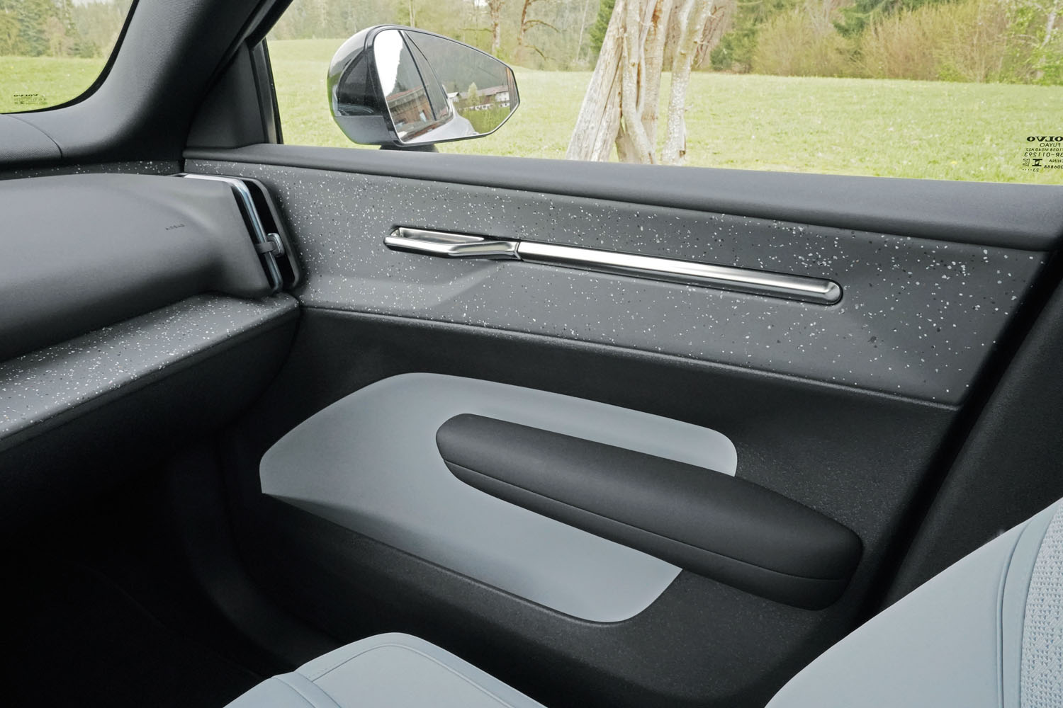 Gleich beim Einsteigen fällt der sehr reduzierte und hochmoderne Look auf. Volvo bietet für den EX30 vier unterschiedliche Innenausstattungen, die sich in den Farben und teilweise auch Materialien unterscheiden. Passend zur Außenfarbe ist es beim Testfahrzeug der Innenraum „Breeze“. Bei allen Varianten stehen erneuerbare und recycelte Materialen im Vordergrund. Besonders auffällig sind die Dekoreinlagen, denen die eingeschlossenen Partikel der verwendeten Kunststoffabfälle einen einzigartigen Look verleihen.