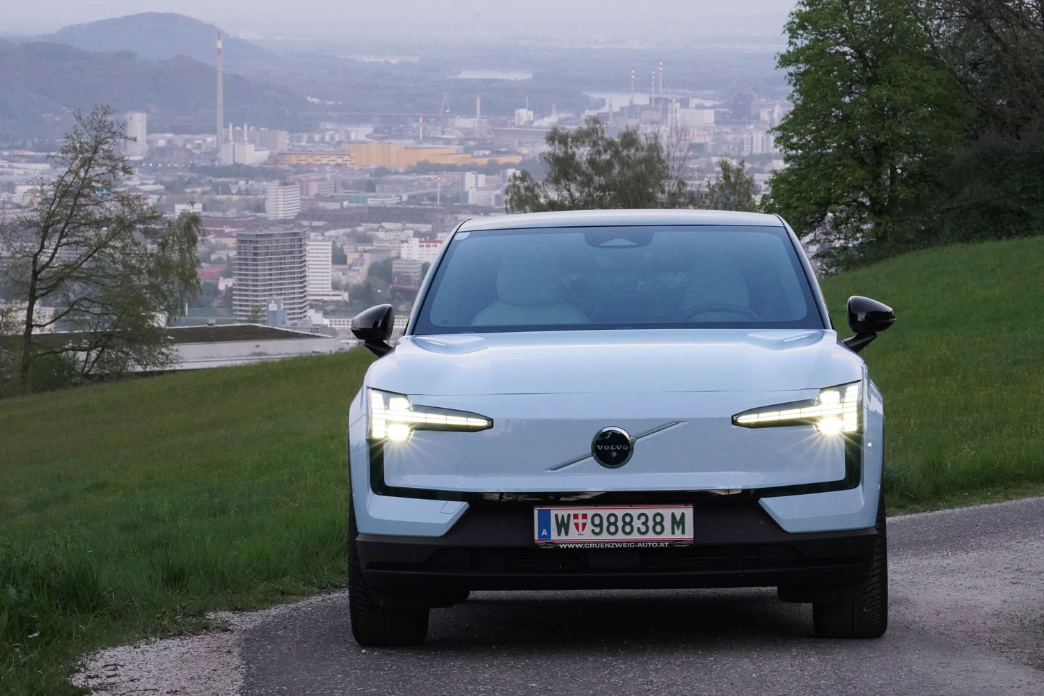 Die kurvige Straße hinauf zum Pöstlingberg zeigte erstmals die Qualität des Fahrwerks. Hier ist Volvo EX30 eine optimale Mischung aus Komfort und Agilität gelungen. Vorne arbeiten McPherson-Federbeine mit neuen Stabilisatoren. Die Fünflenker-Konfiguration an der Hinterachse ist speziell auf den Einsatz in Elektrofahrzeugen abgestimmt. Das Ergebnis kann sich sehen lassen. Noch zusätzlich von der tief eingebauten Lithium-Ionen-Batterie begünstigt, klebt der kompakte SUV förmlich auf der Straße. Daran konnte auch starker Regen und viel Wasser auf der Straße zu einem späteren Zeitpunkt des Tests nichts ändern. Dank des Allradantriebs zeigte sich die Traktion von den widrigen Verhältnissen vollkommen unbeeindruckt. Das zur jeweiligen Fahrsituation passende Drehmoment wird dabei von den Elektromotoren im optimalen Verhältnis an die Vorder- und Hinterräder übertragen.