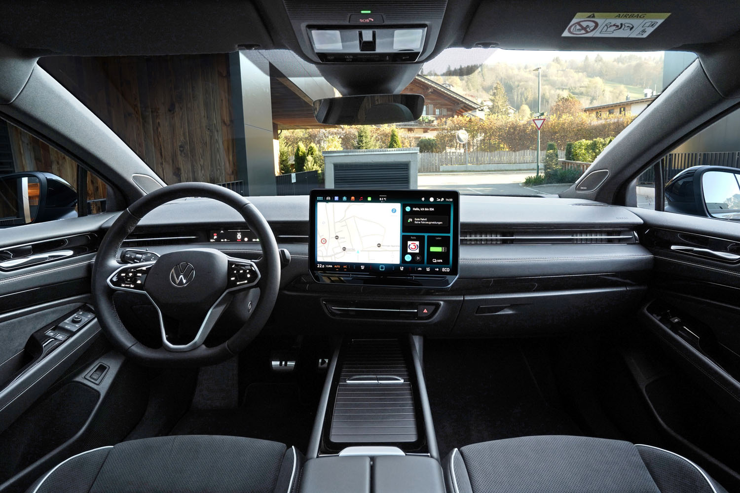 Das Lederlenkrad liegt sehr gut in der Hand und lässt sich übersichtlich bedienen. Über eine außergewöhnliche Funktion verfügt das Panoramadach: Mittels Wischen über ein Touch-Feld in der Dachkonsole lässt sich das Glas zwischen blickdichtem und durchsichtigem Zustand hin- und herschalten. Direkt vor mir im Blickfeld hatte das kleine Fahrerdisplay mit den wichtigsten Informationen und das darüber liegende Head-up-Display mit Augmented-Reality-Funktion, die zusätzliche Informationen direkt auf die Scheibe projiziert. Über den mittig angebrachten 15-Zoll-Touchscreen lassen sich nahezu alle Funktionen einstellen. Unter dem Display befinden sich Touch-Felder zur direkten Einstellung von Temperatur und Lautstärke. Für erstklassigen Ton sorgte das optional erhältliche „Harmann-Kardon“-Soundsystem mit 12+1 Lautsprechern und einer Gesamtleistung von 700 Watt.