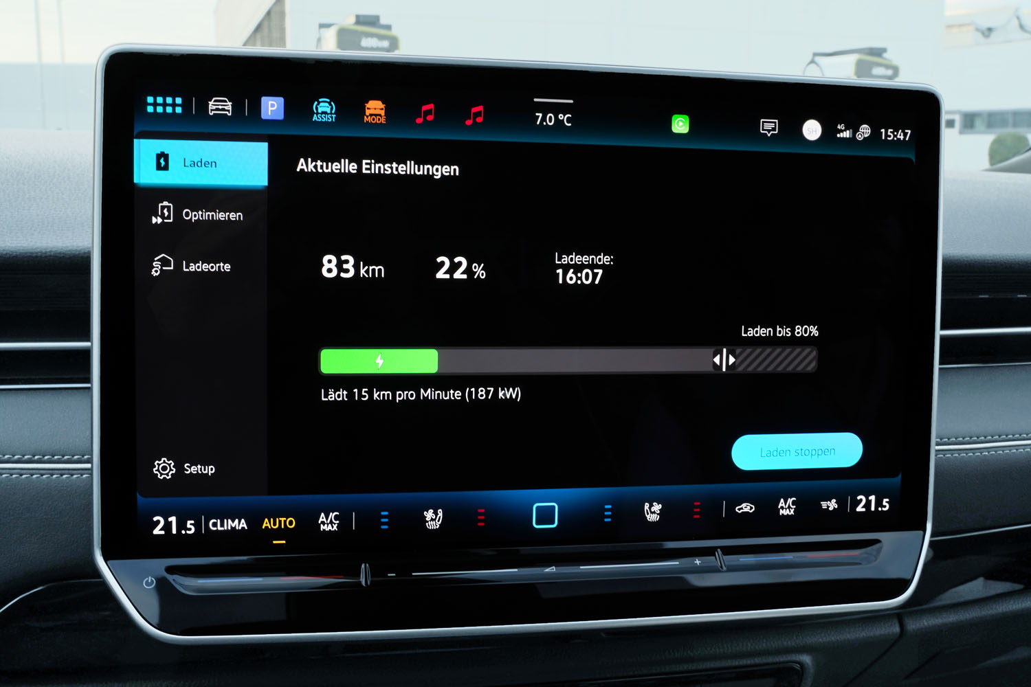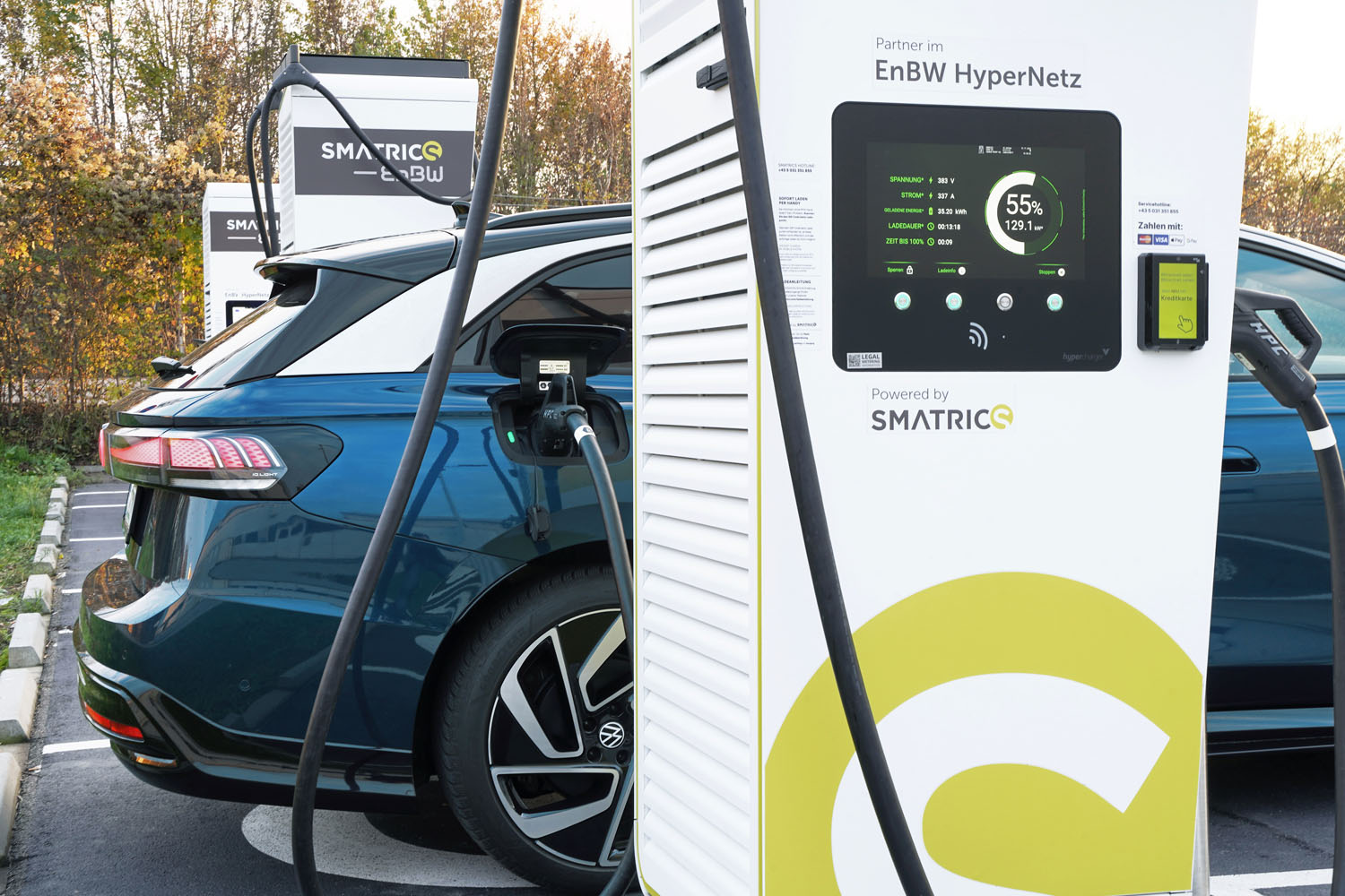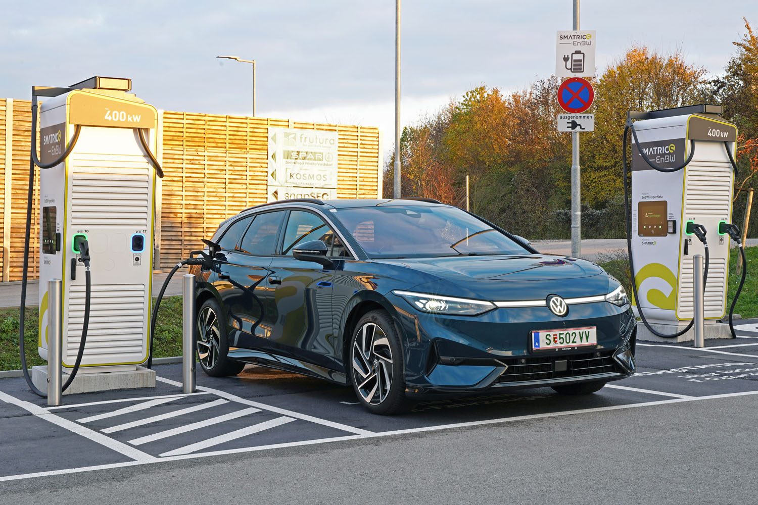 Auf der Fahrt nach Wien kam ich mit 11 Prozent SoC beim Smatics EnBw-Ladepark beim Designer Outlet Salzburg an. Durch die aktive e-Routenplanung im Navigationssystem war die Batterie bereits auf eine optimale Ladeleistung vorkonditioniert worden. An einem der 400 kW-Hypercharger konnte ich in 26:20 Minuten mit einer durchschnittlichen Ladeleistung von 127 kW auf 80 Prozent aufladen. Maximal waren 188 kW drinnen (Werkangabe: 175 kW). Bei der Rückfahrt von Wien erzielte ich beim neuen Smatrics EnbW Lade-Hub in Vorchdorf nochmals diese Top-Ladeperformance. An einer etwas älteren 300 kW-Ladesäule des gleichen Anbieters am Parkplatz des McDonald’s Margaretengürtel in Wien waren davor maximal 148 kW Ladeleistung möglich, obwohl der ID.7 Tourer dank Vorkonditionierung eine maximal mögliche Ladeleistung von 186 kW anzeigte. Dies wirkte sich allerdings nicht wesentlich auf die Ladedauer aus. In 27:26 Minuten war der Akku von 16 auf 80 Prozent SoC befüllt.