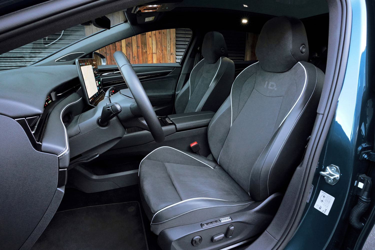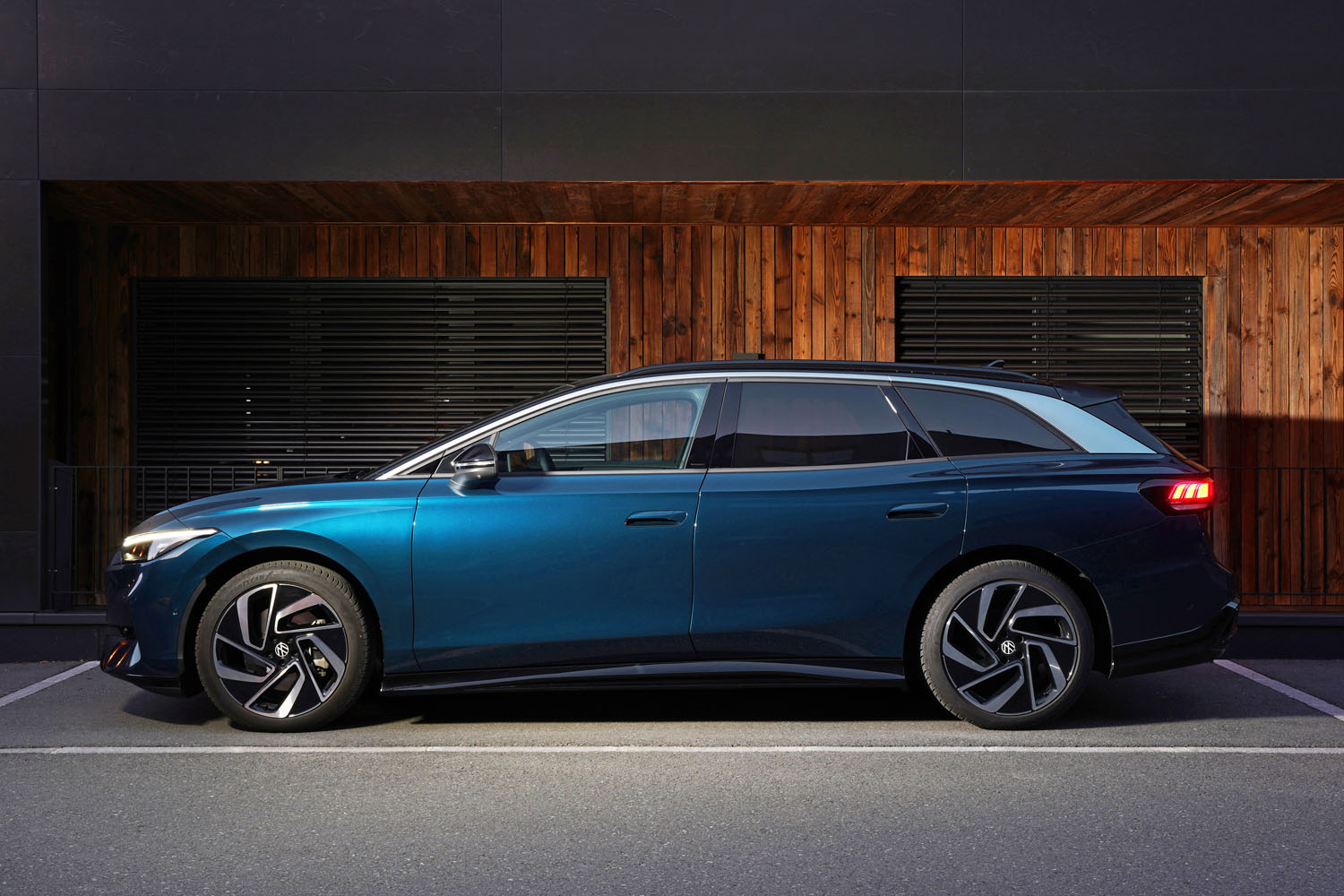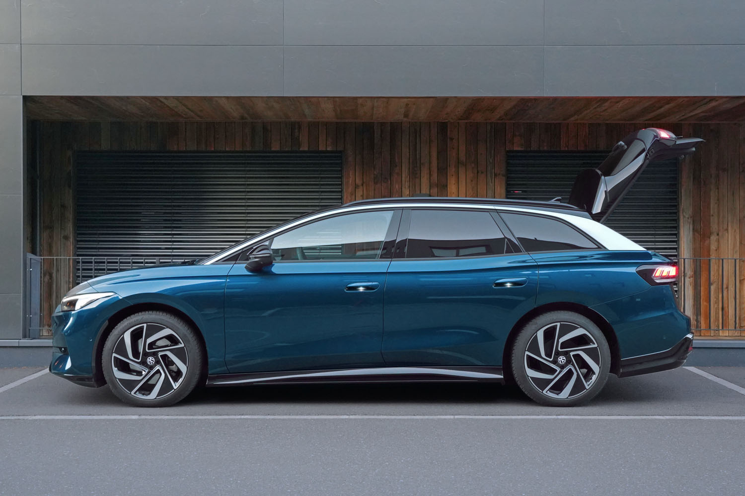 Als farbiger Kontrast sind Dach, Außenspiegel und Schweller des Wagens in Schwarz gehalten. Die silberne Farbe, die sich von der A- bis zur D-Säule erstreckt, verleiht dem Kombi einen modernen Look. Dieser wird durch die futuristisch wirkenden 20-Zoll-Räder zusätzlich verstärkt. In der getesteten Ausführung „Pro“ verfügt der VW ID.7 Tourer über die kleinere 77 kW-Batterie. In der Variante „Pro S“ ist der größerer Akku mit einem Netto-Energiegehalt von 86 kWh verbaut. Mit dem Sondermodell „Business“ erhält man umfangreiche Zusatzausstattung zu einem vergünstigten Preis.